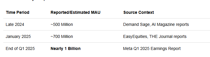 如果 Meta 能擢升 Llama 模子才气、切入搜索市集,高涨空间会很大。据 Meta 2025 年一季度财报及 AffiliateBooster 集合的其他数据,Meta AI 的月活跃用户(MAU)自 2024 年底已翻倍至近 10 亿(见下表)。快速增长的原因是 “无缝整合” 和 “广阔用户群”。Meta 已有效户技能份额,当今只需推出一款和其他大讲话模子水平尽头的居品。