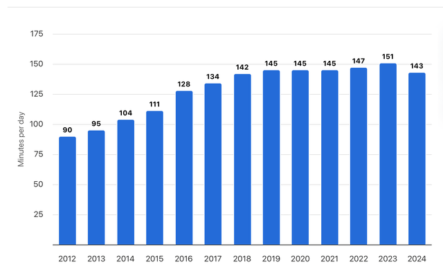 用户在 Meta 平台的平均使用时长情况较复杂。据 Statista,全球网民每天花在酬酢媒体上的技能在 2023 年达峰。这意味着酬酢媒体举座增长红利可能已过,当今要抢市集份额(即用户技能份额)。