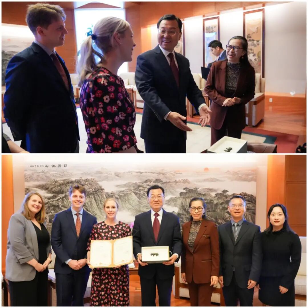 2025年10月16日,中国驻好意思国大使谢锋代表中国政府接纳好意思方民间机构代表、莫里斯艺术法律事务所创举东谈主莫里斯代为返还的虎形牌饰文物。